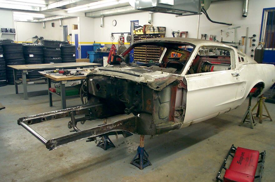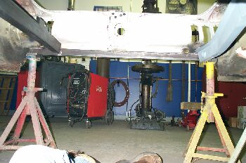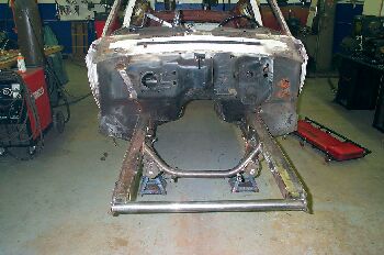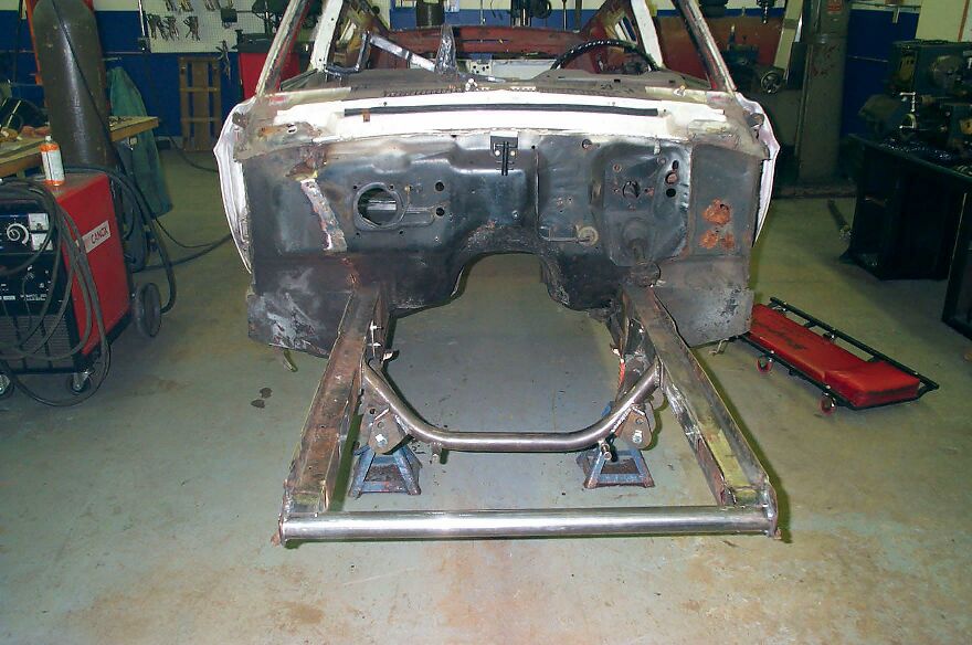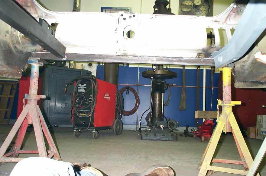 As can be seen the engine compartment is completely removed. The firewall is also going under the knife. The bulge for the heater box is getting removed so that the firewall is flat. This will add a bit of room. The lower frame rails were rusted and had to be patched.