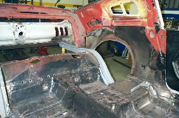 Being a Northern car (even after lots of patching years ago) there was a lot of rot. The rear frame rails and torque box's were removed and new ones put in. The last 40 or so of the rail is removed and a straight piece is put in its place to allow for more tire clearance.